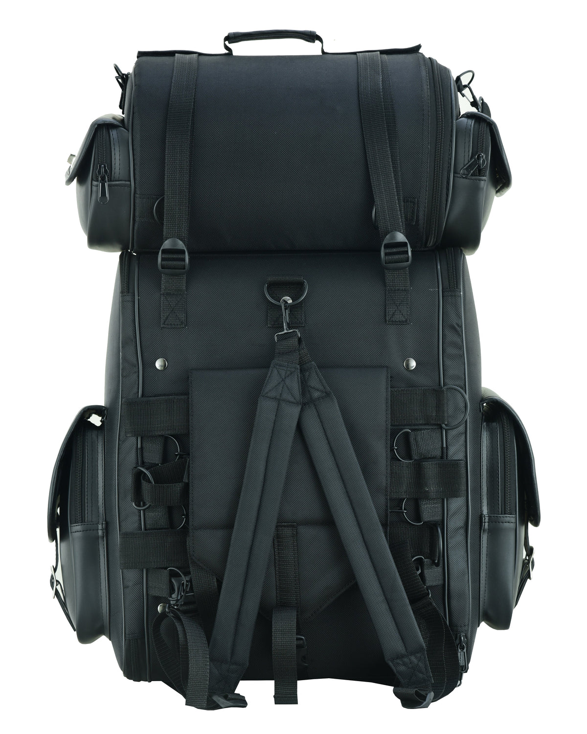 Top roll bag for extra cargo capacity with shoulder strap and cargo straps that can mount the roll bag or strap down extra gear; jacket, rain gear, sweatshirt, etc.