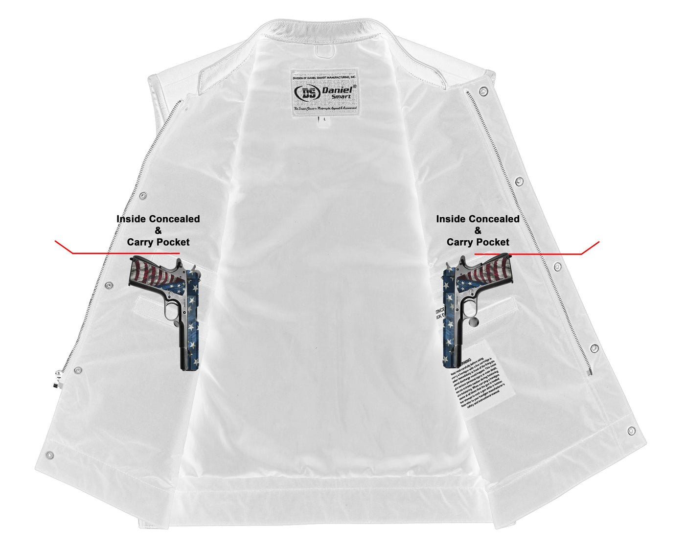 2 inside concealed gun pockets made of special heavy duty textile with built-in holsters and snap closure.