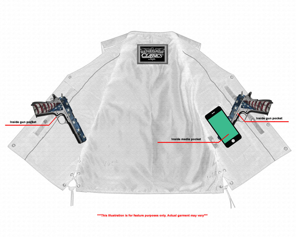 You can keep your firearms with you and ride in style with our classic lace-up leather vest.