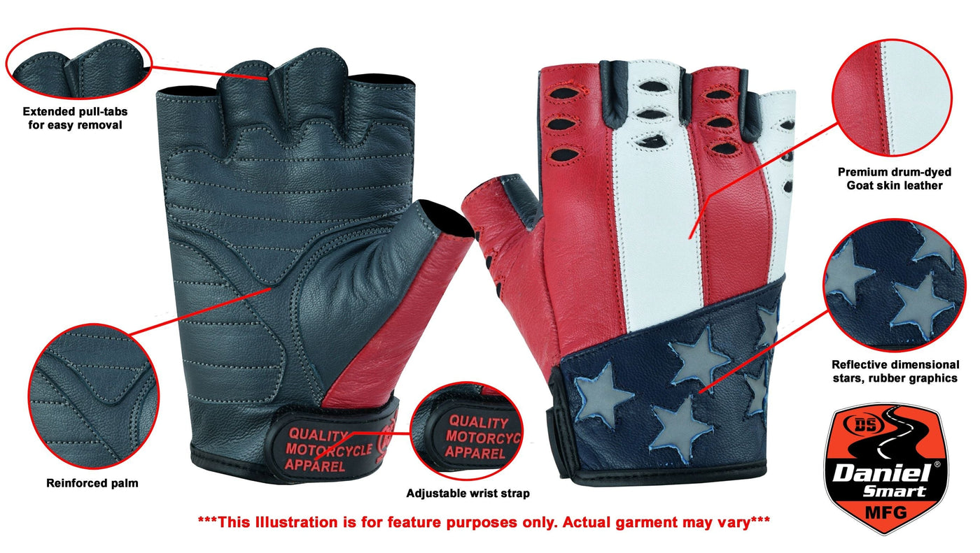 Men's fingerless glove made in premium drum-dyed Goat skin leather. Featuring reinforced palm for long haul comfort, extended pull-tabs for easy removal, reflective dimensional stars, rubber graphics and an adjustable wrist strap.