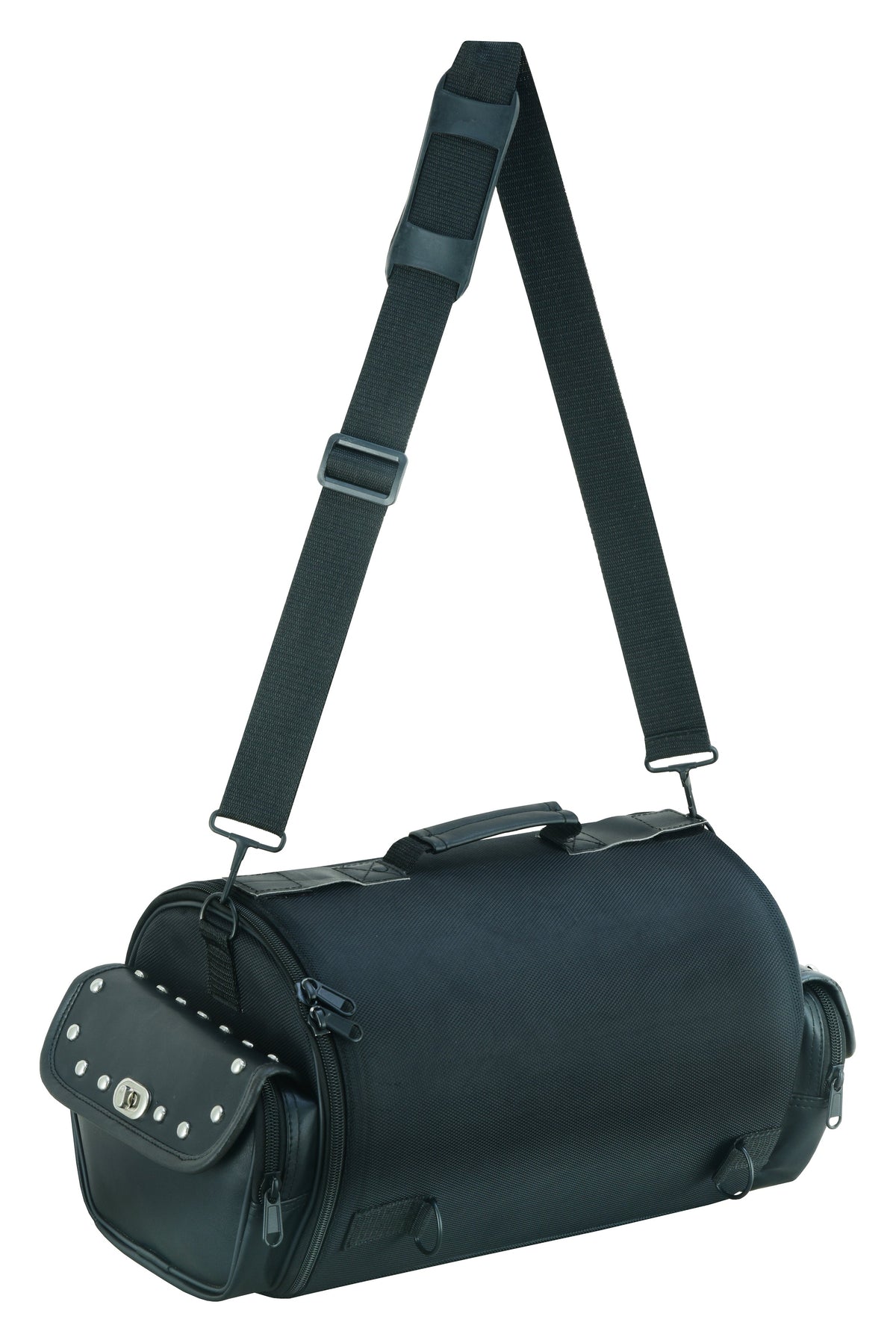 Top roll bag for extra cargo capacity with shoulder strap and cargo straps that can mount the roll bag or strap down extra gear; jacket, rain gear, sweatshirt, etc.