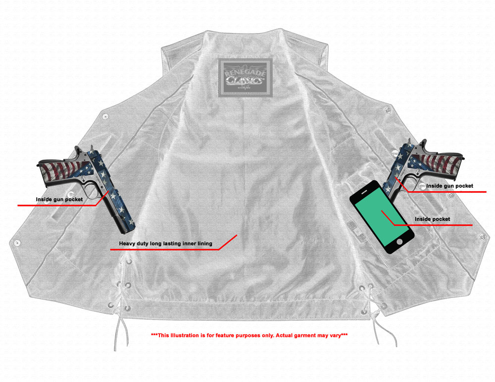 This vest features two hand pockets and two concealed carry pockets in the chest area. Each concealed carry pocket comes with built-in holsters and snap closures for easy access. We reinforce the shoulders for maximum gun concealment.