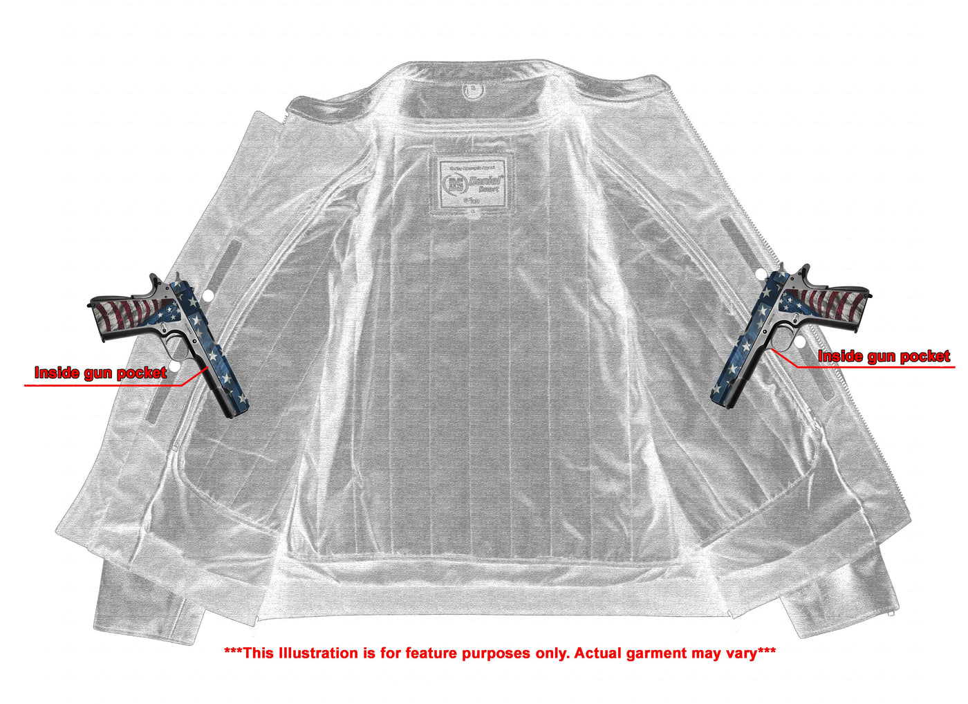 2 inside concealed gun pockets made of special heavy duty textile with built-in holsters and snap closure.