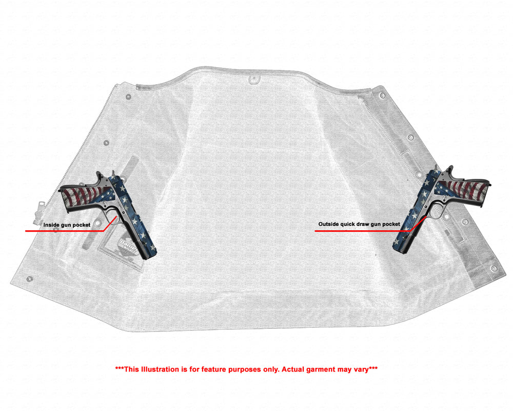 2 upgraded style concealed gun pockets between the snap and the zipper made of special heavy-duty textile with built-in holsters and snap closure.