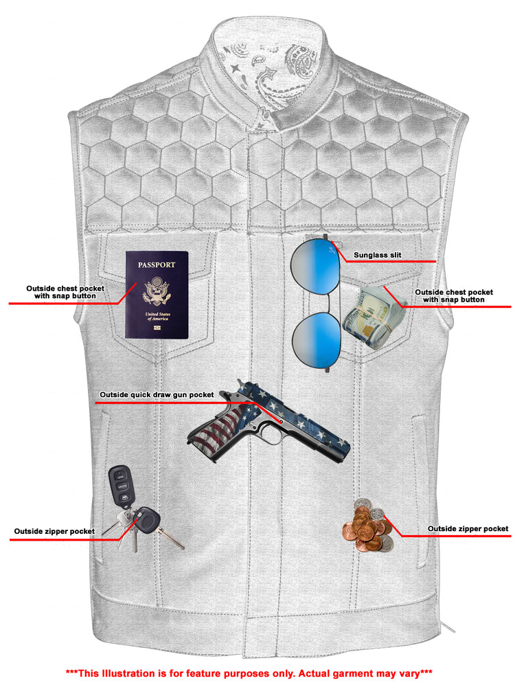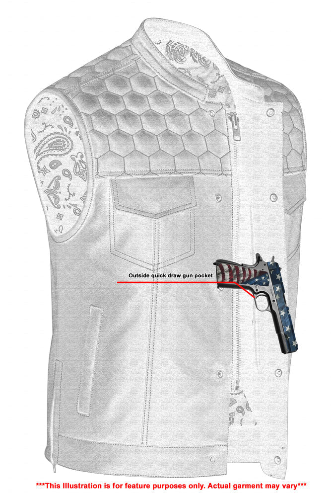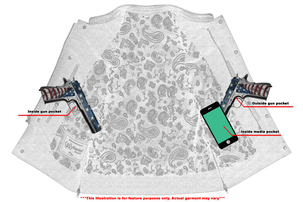 2 upgraded style concealed gun pockets 1 between the snap and the zipper made of special heavy-duty textile with built-in holsters and snap closure.