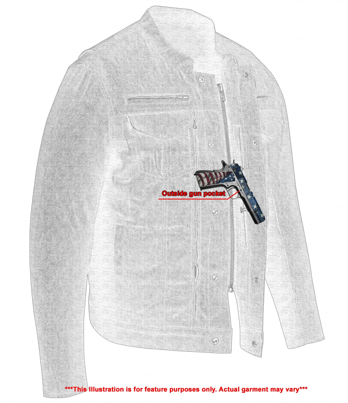 2 upgraded style concealed gun pockets between the snap and the zipper made of special heavy-duty textile with built-in holsters and snap closure.