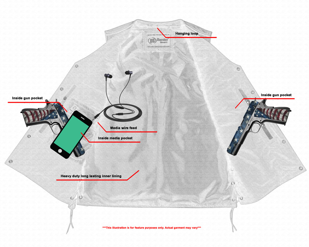 2 inside concealed gun pockets made of special heavy-duty textile with built-in holsters and snap closure.