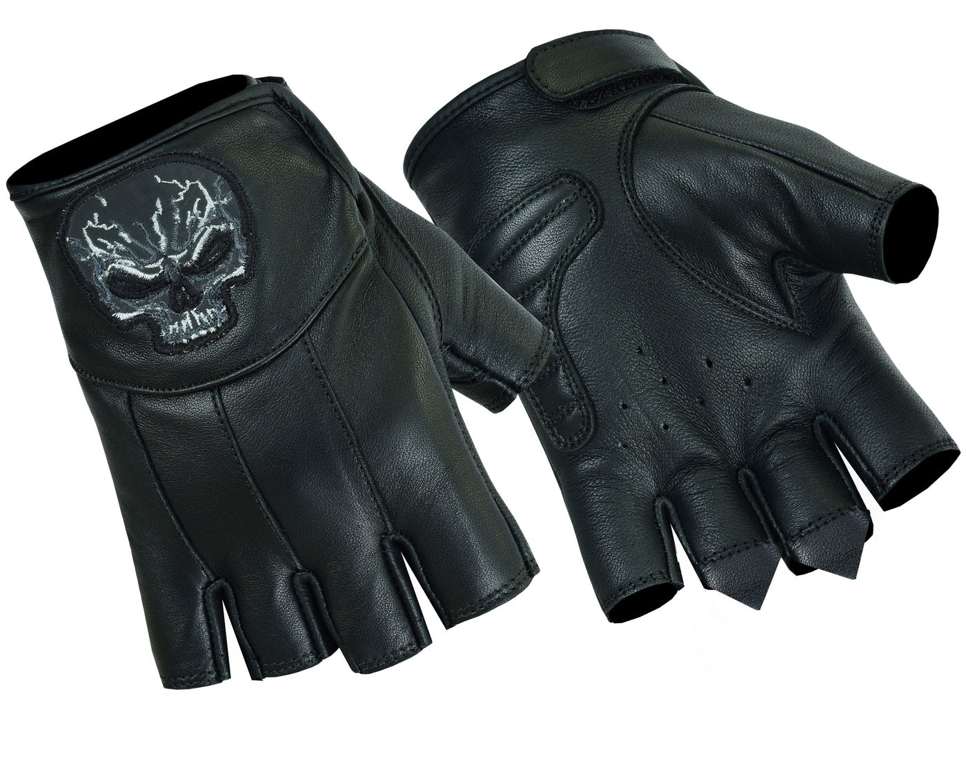 Men's fingerless glove made in premium drum-dyed naked goat leather. Featuring gel palm for long haul comfort, pull-tabs allow for easy removal, an adjustable wrist strapand specially designed skulls to reflect when headlights turn on at night.