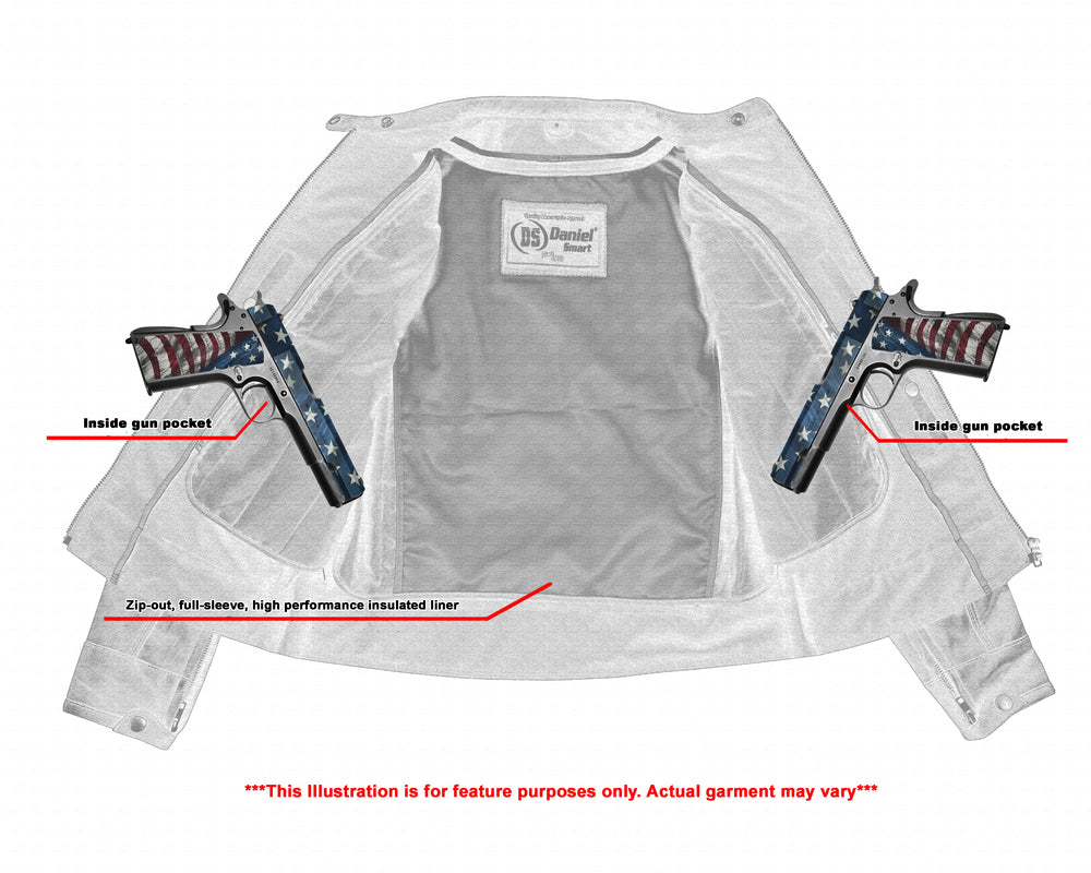 2 inside concealed Smart Access Pocket made of special heavy-duty textile with built-in holsters and snap closure.
