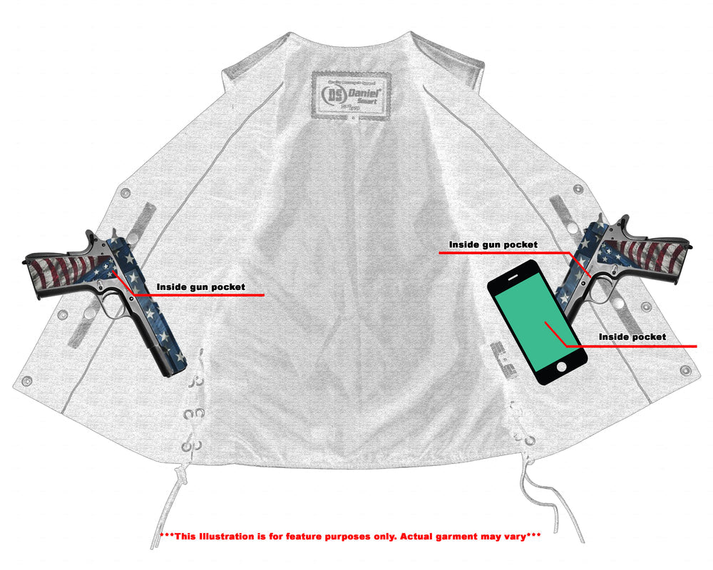 2 inside concealed gun pockets made of special heavy-duty textile with built-in holsters and snap closure.