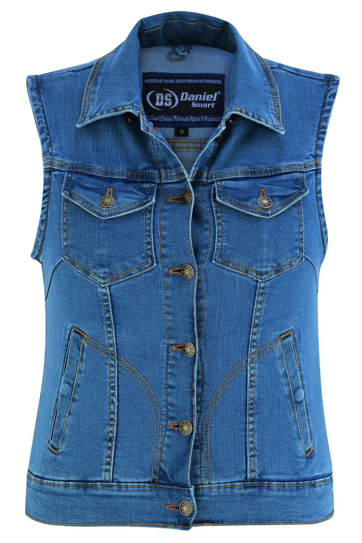 Our products come with lifetime warranties. We offer a simple exchange and return policy, too. Buy your women's blue denim snap front biker vest today.